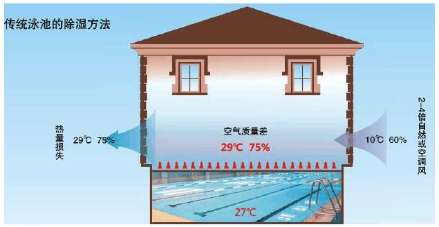 室內(nèi)泳池空氣的解決方案“加熱+空調(diào)”方式,即通過排走室內(nèi)高氯的高濕空氣排到室外